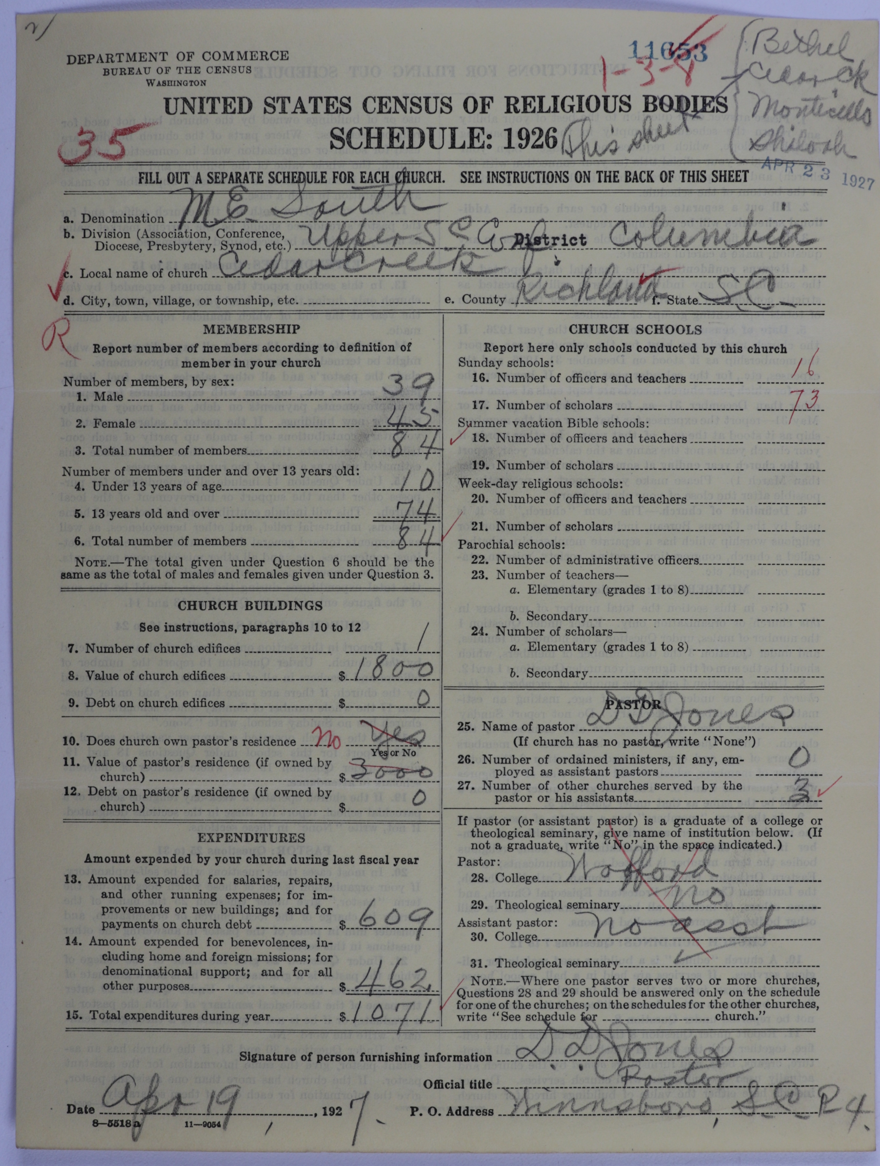 - Methodist Episcopal Church, South: 11653