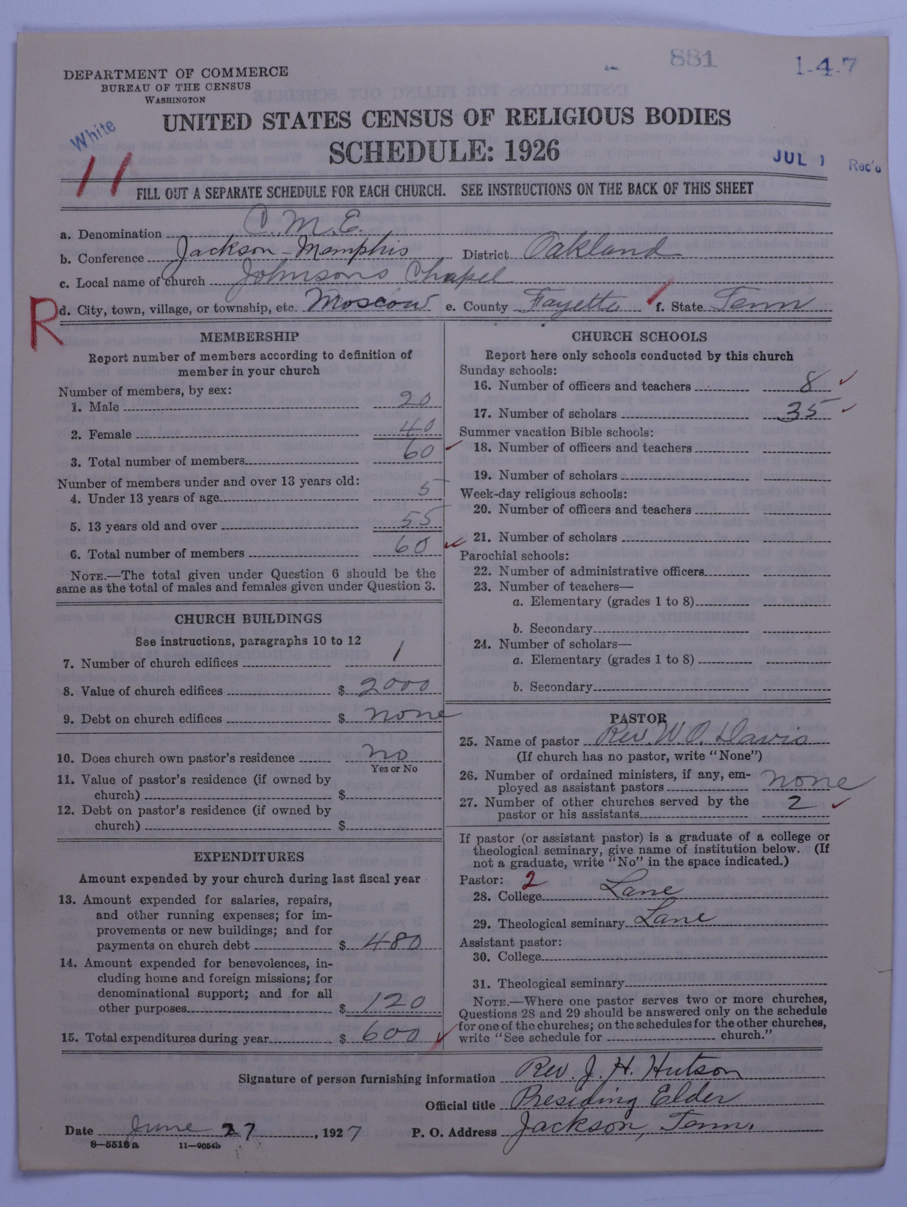 Colored Methodist Episcopal Church: 881