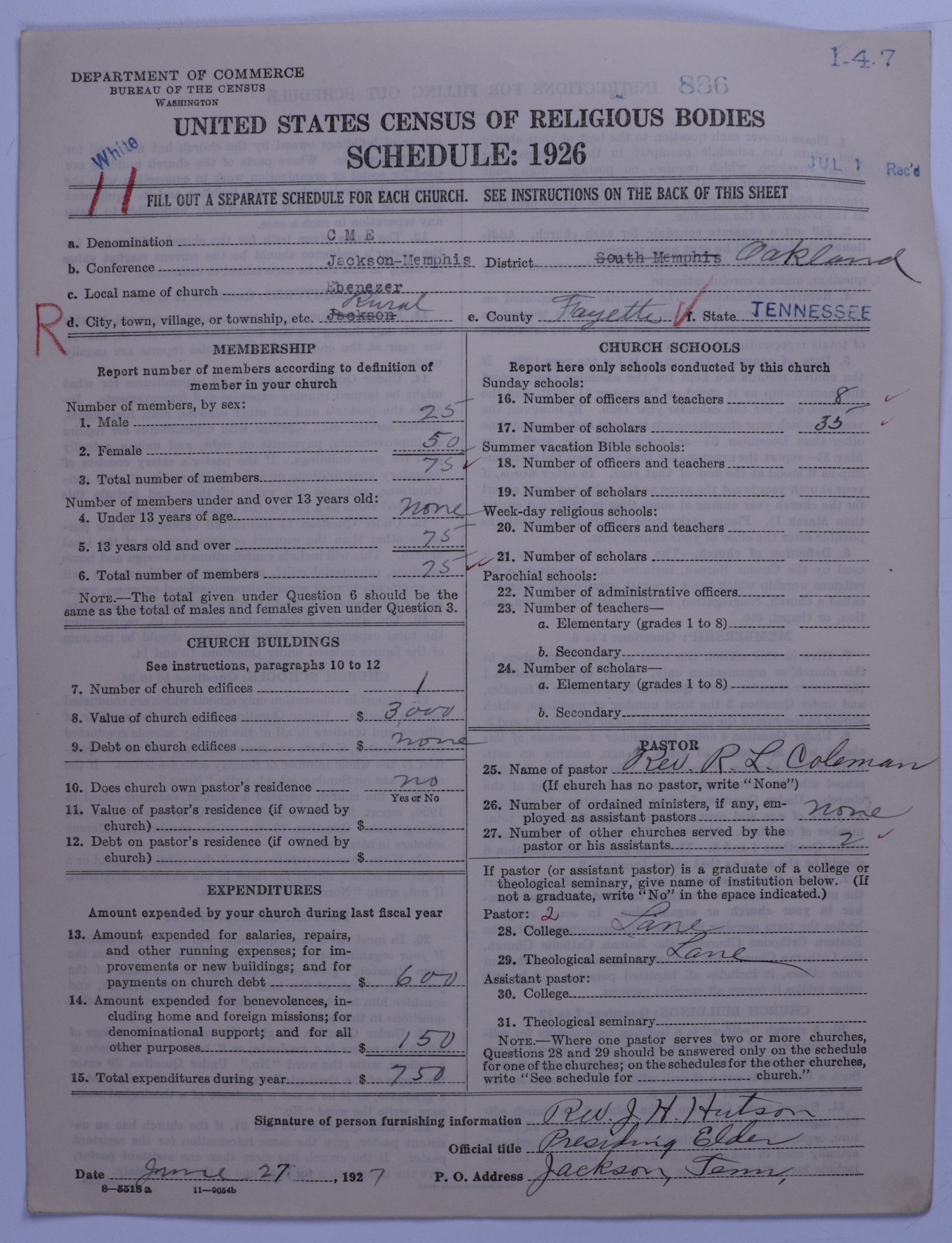 Colored Methodist Episcopal Church: 886