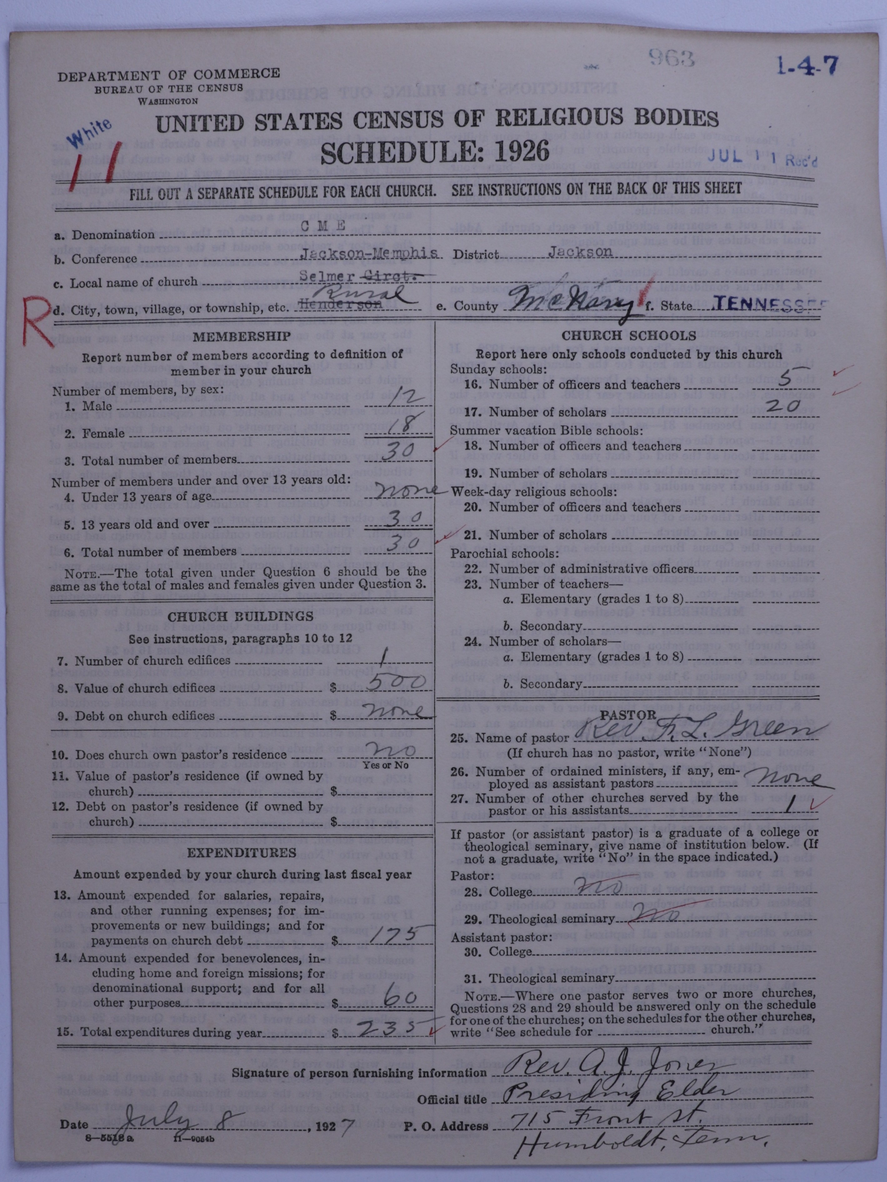 Colored Methodist Episcopal Church: 963