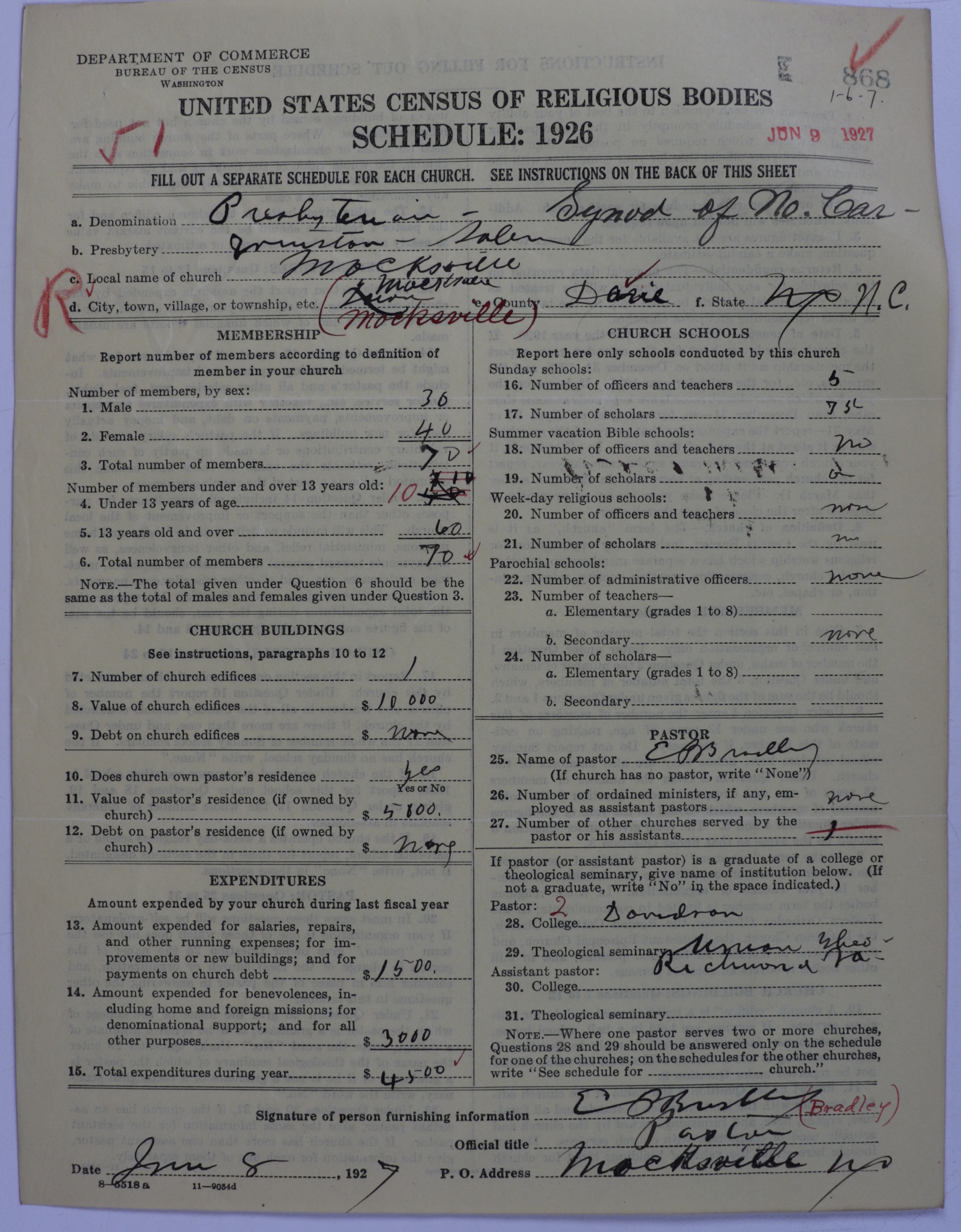 - Presbyterian Church in the United States: 868