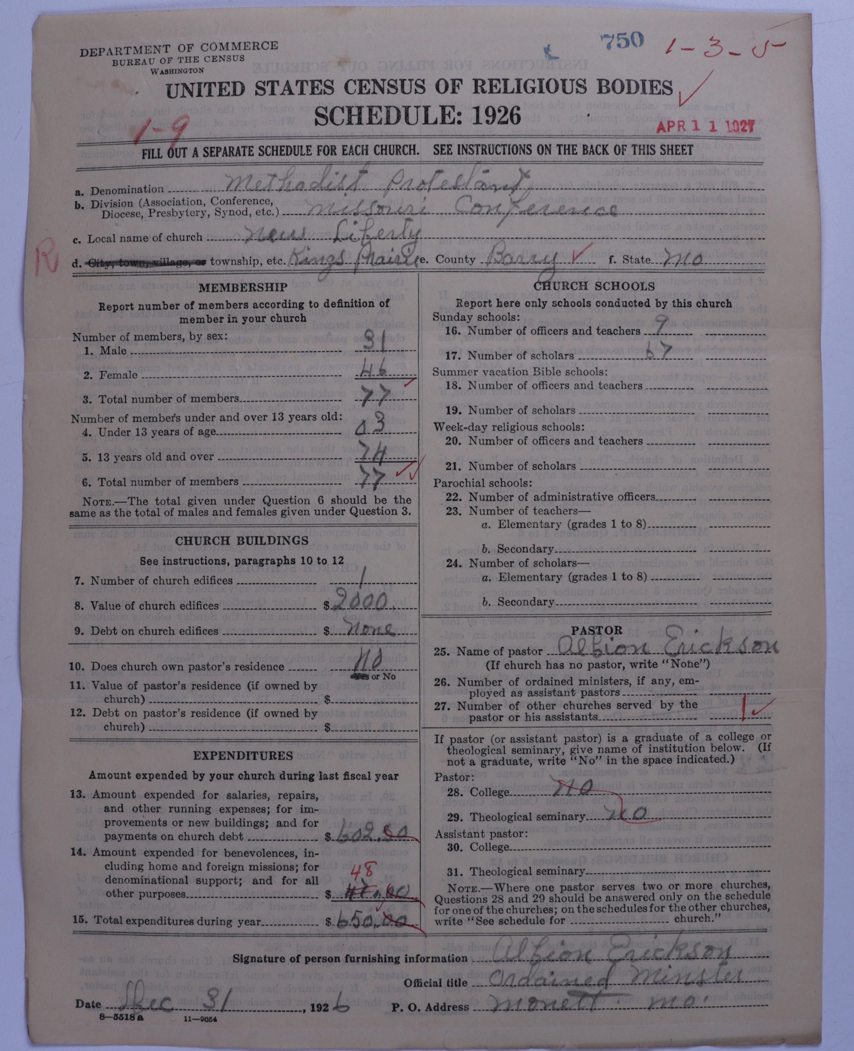 - Methodist Protestant Church: 750